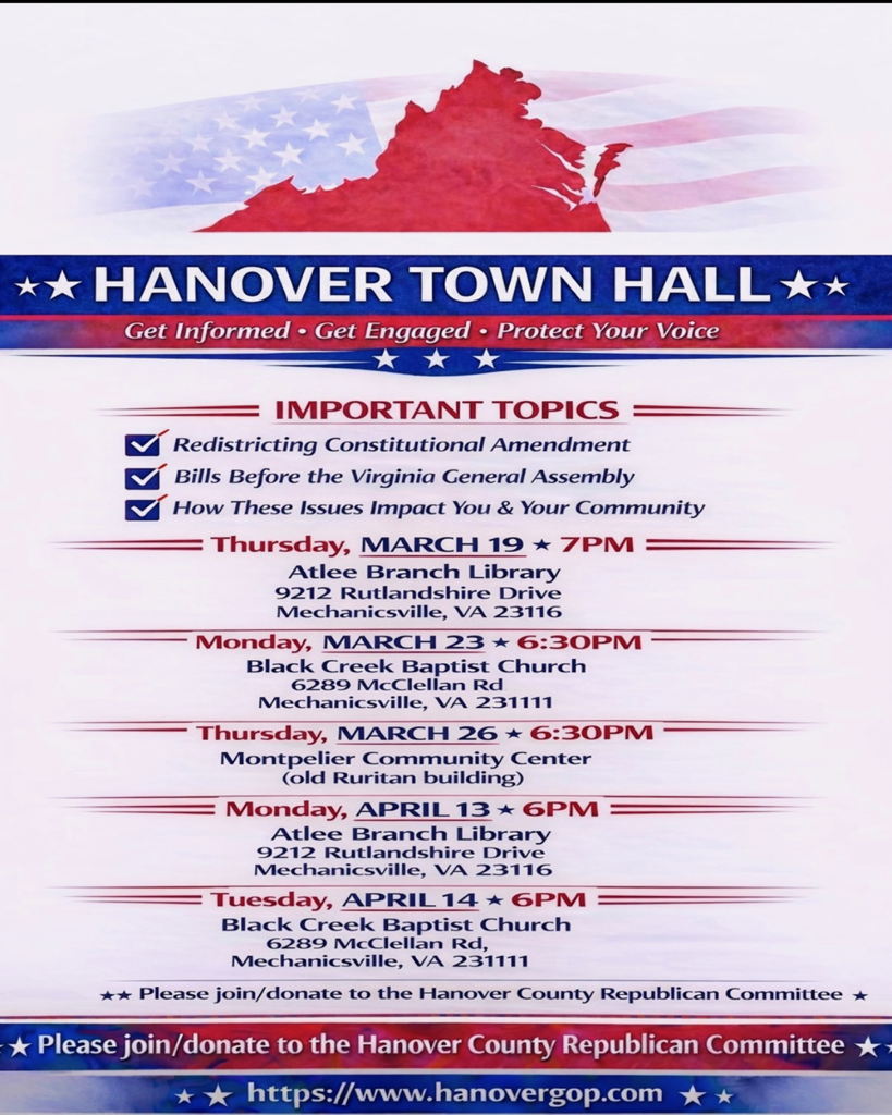 Hanover Republican Women’s Club is taking 2026 applications for a $1000 Scholarship. Click onto 2026 Scholarship-App-1, complete and submit your application to Cherie Kasch (cherie.kasch@icloud.com) (703-475-8962) by Mar 30, 2026.